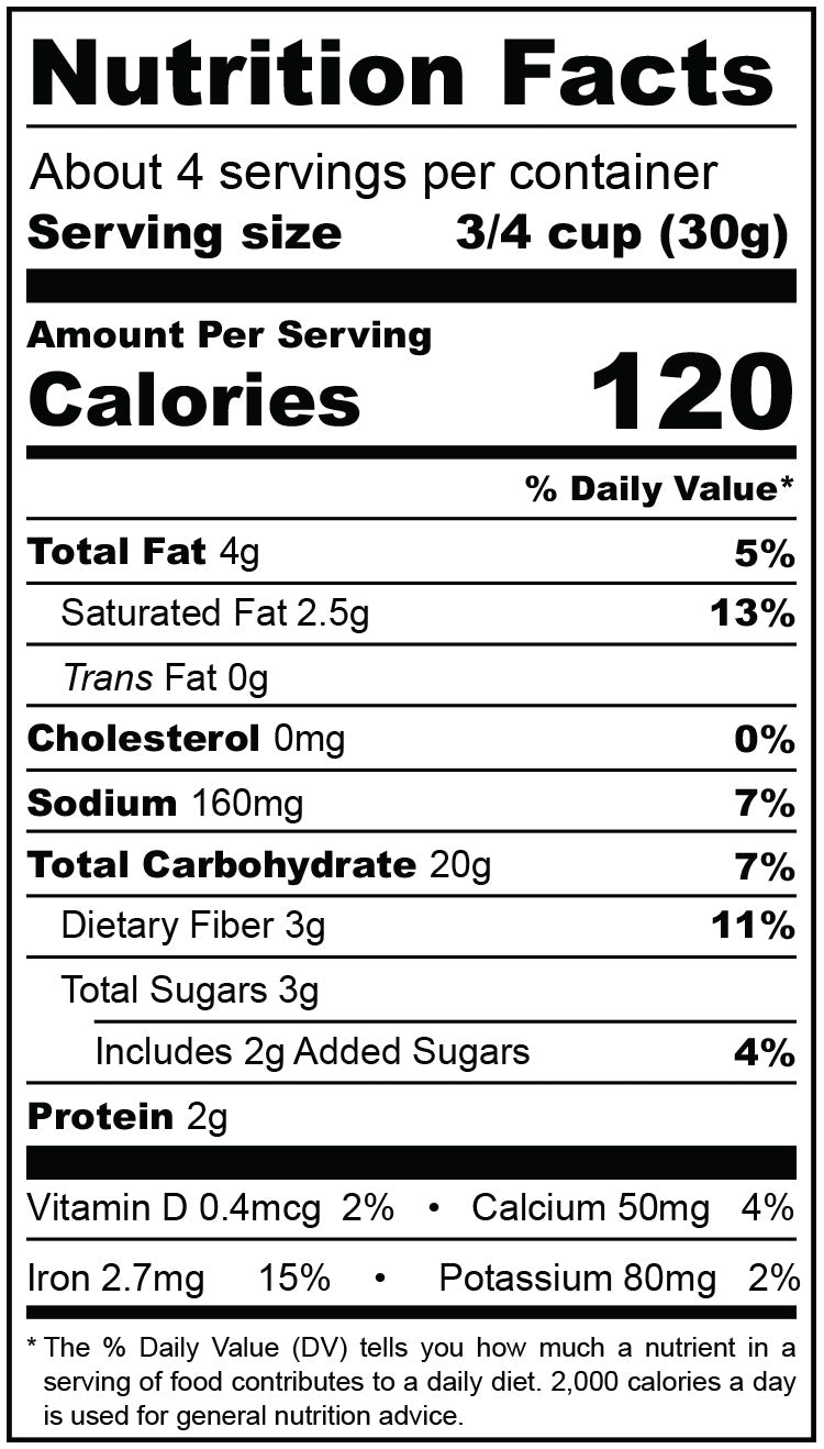 RICE PILLOWS (WHOLE GRAIN RICE, RICE, SUGAR, SALT, MOLASSES. VITAMIN E (MIXED TOCOPHEROLS) ADDED TO PRESERVE FRESHNESS. VITAMINS & MINERALS CALCIUM CARBONATE, IRON AND ZINC (MINERAL NUTRIENTS), VITAMIN C (SODIUM ASCORBATE), A B VITAMIN (NIACINAMIDE), VITAMIN B2 (RIBOFLAVIN), VITAMIN B6 (PYRIDOXINE HYDROCHLORIDE), VITAMIN B1 (THIAMIN MONONITRATE), VITAMIN A (PALMITATE), A B VITAMIN (FOLIC ACID), VITAMIN B12, VITAMIN D3), PUFFED WHOLE CORN, QUINOA, PRETZELS (CASSAVA FLOUR, POTATO STARCH, CHICKPEA FLOUR, HIGH OLEIC SUNFLOWER OIL, TAPIOCA STARCH, SALT, DATE SYRUP, YEAST, SUNFLOWER LECITHIN), COCONUT OIL, PREBIOTIC CORN FIBER, BROWN SUGAR, ACACIA FIBER, TOASTED SESAME OIL, BLACK SESAME SEEDS, ONION POWDER, MAPLE SUGAR, TAMARI POWDER(SOYBEANS, SALT), ORANGE JUICE POWDER (MALTODEXTRIN, ORANGE JUICE SOLIDS, ORANGE OIL), GOCHUGARU CHILI FLAKES, APPLE CIDER VINEGAR POWDER, SMOKED PAPRIKA, GARLIC POWDER, SPICE, SEA SALT, ROSEMARY EXTRACT (SUNFLOWER OIL, ROSEMARY EXTRACT), CAYENNE PEPPER.