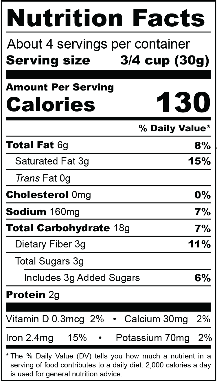 RICE PILLOWS (WHOLE GRAIN RICE, RICE, SUGAR, SALT, MOLASSES. VITAMIN E (MIXED TOCOPHEROLS) ADDED TO PRESERVE FRESHNESS. VITAMINS & MINERALS CALCIUM CARBONATE, IRON AND ZINC (MINERAL NUTRIENTS), VITAMIN C (SODIUM ASCORBATE), A B VITAMIN (NIACINAMIDE), VITAMIN B2 (RIBOFLAVIN), VITAMIN B6 (PYRIDOXINE HYDROCHLORIDE), VITAMIN B1 (THIAMIN MONONITRATE), VITAMIN A (PALMITATE), A B VITAMIN (FOLIC ACID), VITAMIN B12, VITAMIN D3), PEANUT BUTTER (PEANUTS), PRETZELS (CASSAVA FLOUR, POTATO STARCH, CHICKPEA FLOUR, HIGH OLEIC SUNFLOWER OIL, TAPIOCA STARCH, SALT, DATE SYRUP, YEAST, SUNFLOWER LECITHIN), COCONUT OIL, QUINOA, PUFFED WHOLE CORN, BROWN SUGAR, PREBIOTIC CORN FIBER, ACACIA FIBER, NATURAL FLAVOR, SEA SALT, ROSEMARY EXTRACT (SUNFLOWER OIL, ROSEMARY EXTRACT), CINNAMON.