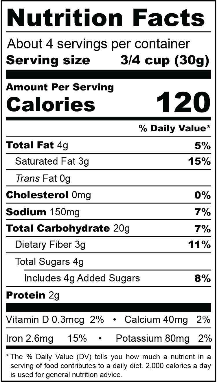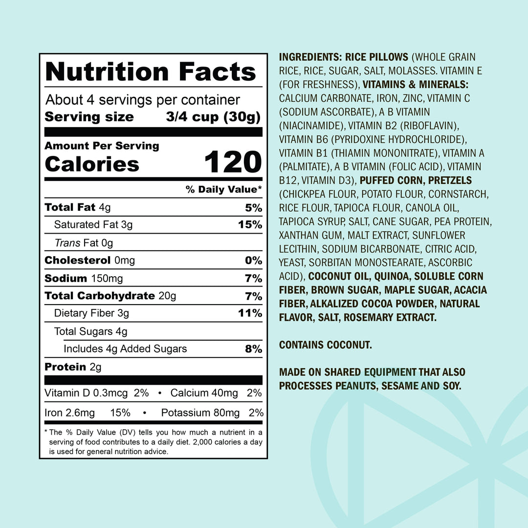 RICE PILLOWS (WHOLE GRAIN RICE, RICE, SUGAR, SALT, MOLASSES. VITAMIN E (MIXED TOCOPHEROLS) ADDED TO PRESERVE FRESHNESS. VITAMINS & MINERALS CALCIUM CARBONATE, IRON AND ZINC (MINERAL NUTRIENTS), VITAMIN C (SODIUM ASCORBATE), A B VITAMIN (NIACINAMIDE), VITAMIN B2 (RIBOFLAVIN), VITAMIN B6 (PYRIDOXINE HYDROCHLORIDE), VITAMIN B1 (THIAMIN MONONITRATE), VITAMIN A (PALMITATE), A B VITAMIN (FOLIC ACID), VITAMIN B12, VITAMIN D3), PUFFED WHOLE CORN, PRETZELS (CASSAVA FLOUR, POTATO STARCH, CHICKPEA FLOUR, HIGH OLEIC SUNFLOWER OIL, TAPIOCA STARCH, SALT, DATE SYRUP, YEAST, SUNFLOWER LECITHIN), COCONUT OIL, QUINOA, PREBIOTIC CORN FIBER, BROWN SUGAR, MAPLE SUGAR, ACACIA FIBER, ALKALIZED COCOA POWDER, NATURAL FLAVOR, SEA SALT, ROSEMARY EXTRACT(SUNFLOWER OIL, ROSEMARY EXTRACT).