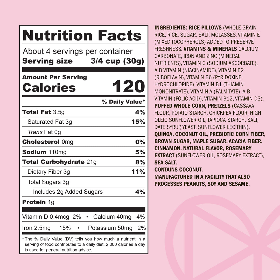 RICE PILLOWS (WHOLE GRAIN RICE, RICE, SUGAR, SALT, MOLASSES. VITAMIN E (MIXED TOCOPHEROLS) ADDED TO PRESERVE FRESHNESS. VITAMINS & MINERALS CALCIUM CARBONATE, IRON AND ZINC (MINERAL NUTRIENTS), VITAMIN C (SODIUM ASCORBATE), A B VITAMIN (NIACINAMIDE), VITAMIN B2 (RIBOFLAVIN), VITAMIN B6 (PYRIDOXINE HYDROCHLORIDE), VITAMIN B1 (THIAMIN MONONITRATE), VITAMIN A (PALMITATE), A B VITAMIN (FOLIC ACID), VITAMIN B12, VITAMIN D3), PUFFED WHOLE CORN, PRETZELS (CASSAVA FLOUR, POTATO STARCH, CHICKPEA FLOUR, HIGH OLEIC SUNFLOWER OIL, TAPIOCA STARCH, SALT, DATE SYRUP, YEAST, SUNFLOWER LECITHIN), QUINOA,