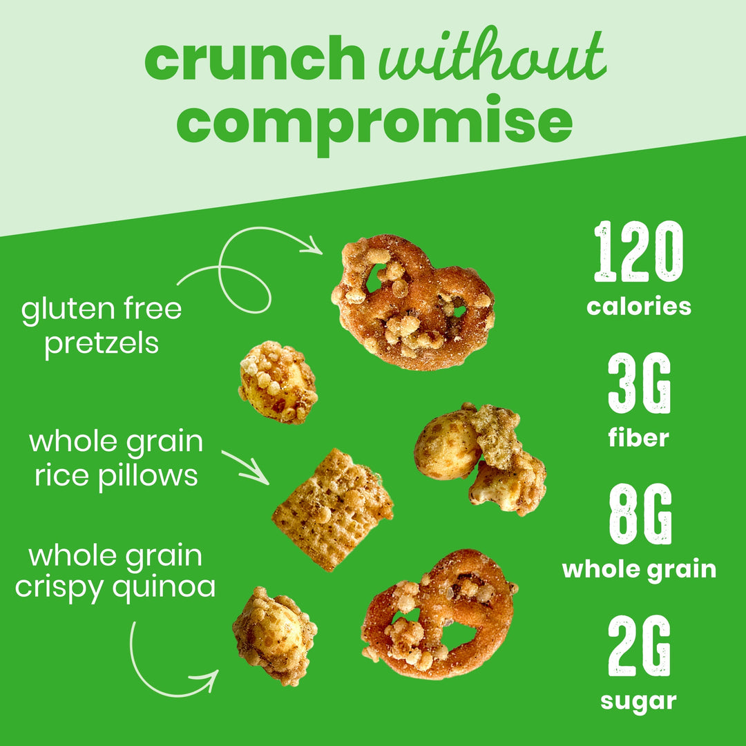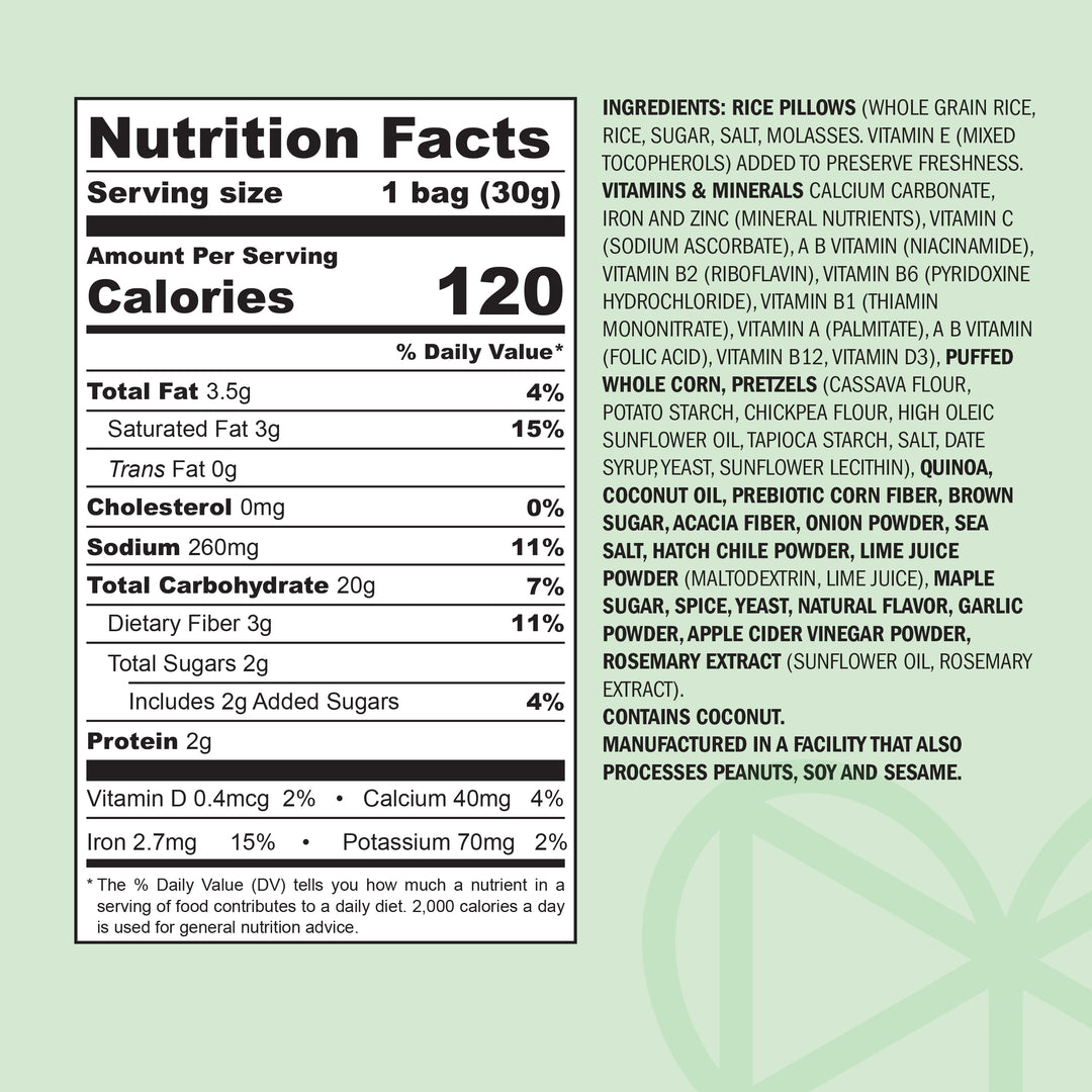 RICE PILLOWS (WHOLE GRAIN RICE, RICE, SUGAR, SALT, MOLASSES. VITAMIN E (MIXED TOCOPHEROLS) ADDED TO PRESERVE FRESHNESS. VITAMINS & MINERALS CALCIUM CARBONATE, IRON AND ZINC (MINERAL NUTRIENTS), VITAMIN C (SODIUM ASCORBATE), A B VITAMIN (NIACINAMIDE), VITAMIN B2 (RIBOFLAVIN), VITAMIN B6 (PYRIDOXINE HYDROCHLORIDE), VITAMIN B1 (THIAMIN MONONITRATE), VITAMIN A (PALMITATE), A B VITAMIN (FOLIC ACID), VITAMIN B12, VITAMIN D3), PUFFED WHOLE CORN, PRETZELS (CASSAVA FLOUR, POTATO STARCH, CHICKPEA FLOUR, HIGH OLEIC SUNFLOWER OIL, TAPIOCA STARCH, SALT, DATE SYRUP, YEAST, SUNFLOWER LECITHIN), QUINOA, COCONUT OIL, PREBIOTIC CORN FIBER, BROWN SUGAR, ACACIA FIBER, ONION POWDER, SEA SALT, HATCH CHILE POWDER, LIME JUICE POWDER (MALTODEXTRIN, LIME JUICE), MAPLE SUGAR, SPICE, YEAST, NATURAL FLAVOR, GARLIC POWDER, APPLE CIDER VINEGAR POWDER, ROSEMARY EXTRACT (SUNFLOWER OIL, ROSEMARY EXTRACT).
