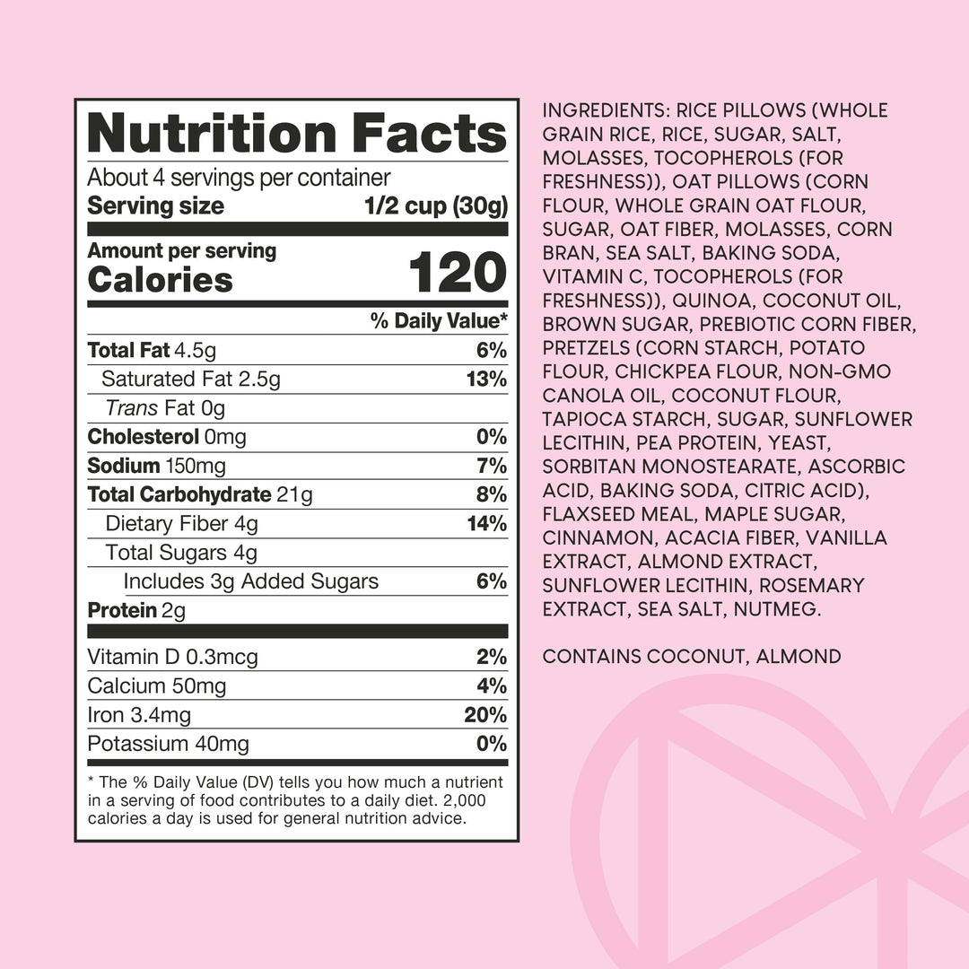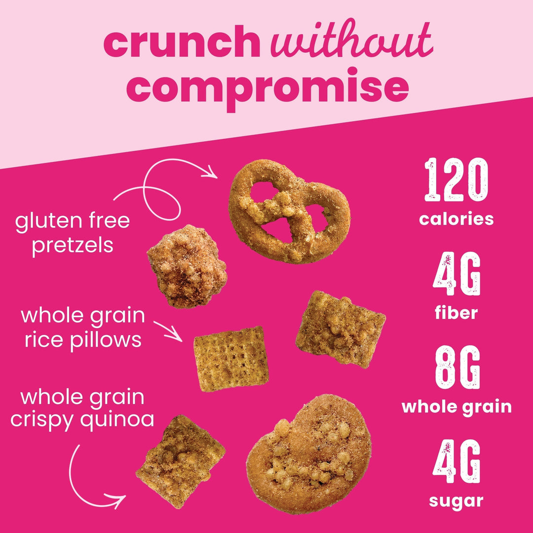 Rich swirls of aromatic Korintje cinnamon and pure vanilla are kissed with organic maple sugar for an irresistibly sweet & spicy treat. With party-ready petite pretzels, whole-grain pillows & a crisp confetti of golden quinoa. Every batch is baked to a big, craveable crunch & showered with love.
