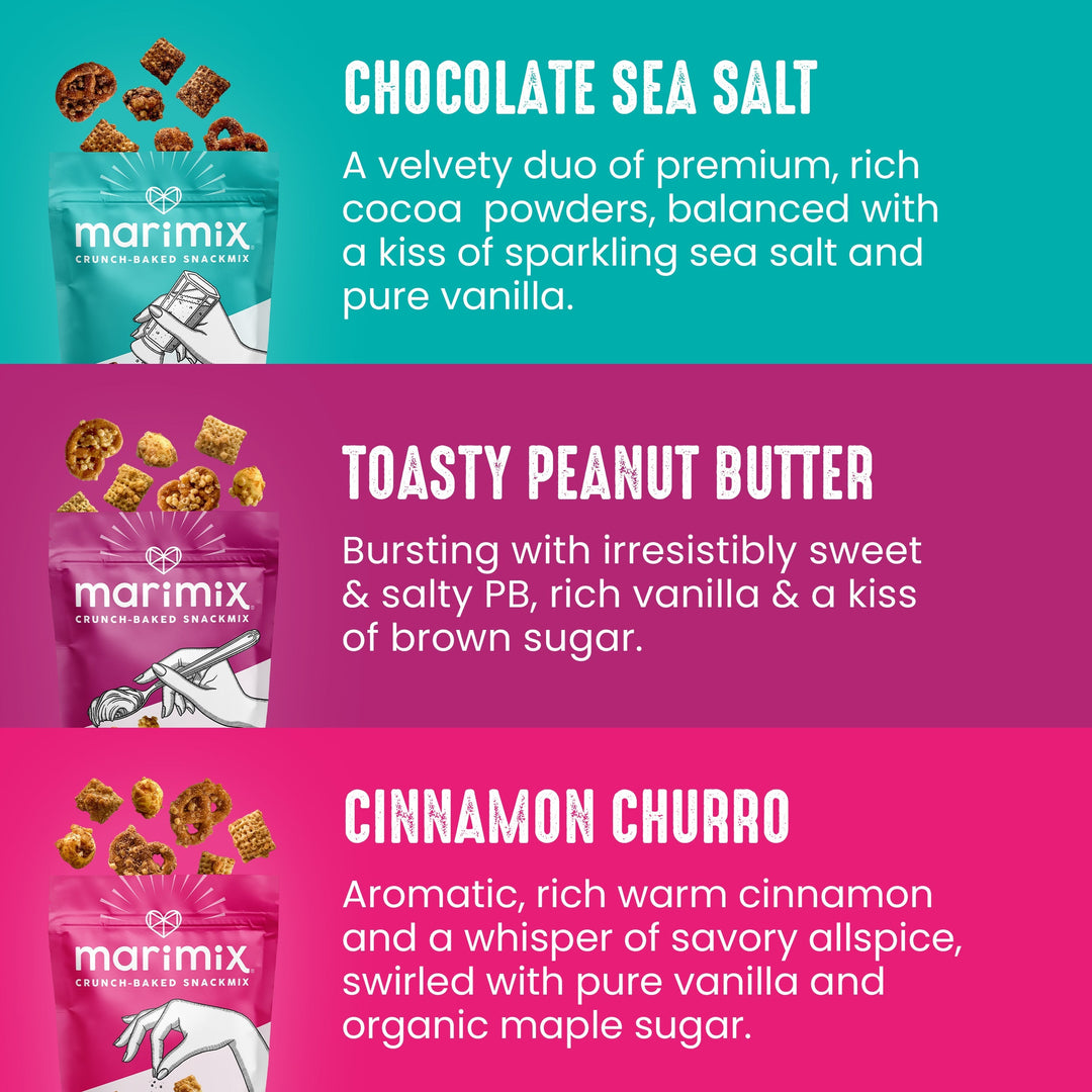 Our Simply Sweet Snackmix collection features an irresistible trio of family-friendly favorites. A wholesome treat for kids (and for every kid-at-heart,) we celebrate your sweet tooth with a swirl of rich spices, pure vanilla and organic maple sugar. Includes: Chocolate Sea Salt, Cinnamon Churro and Toasty Peanut Butter.