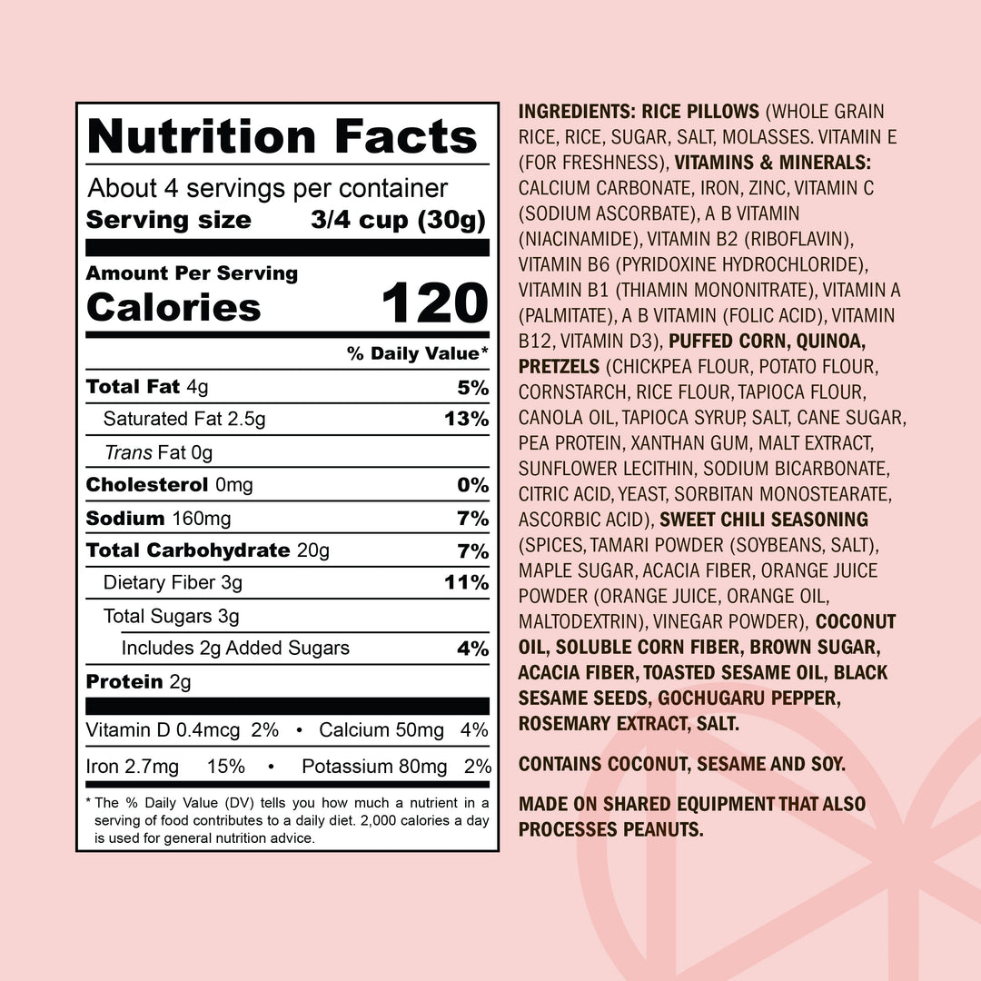 RICE PILLOWS (WHOLE GRAIN RICE, RICE, SUGAR, SALT, MOLASSES. VITAMIN E (MIXED TOCOPHEROLS) ADDED TO PRESERVE FRESHNESS. VITAMINS & MINERALS CALCIUM CARBONATE, IRON AND ZINC (MINERAL NUTRIENTS), VITAMIN C (SODIUM ASCORBATE), A B VITAMIN (NIACINAMIDE), VITAMIN B2 (RIBOFLAVIN), VITAMIN B6 (PYRIDOXINE HYDROCHLORIDE), VITAMIN B1 (THIAMIN MONONITRATE), VITAMIN A (PALMITATE), A B VITAMIN (FOLIC ACID), VITAMIN B12, VITAMIN D3), PUFFED WHOLE CORN, QUINOA, PRETZELS (CASSAVA FLOUR, POTATO STARCH, CHICKPEA FLOUR, HIGH OLEIC SUNFLOWER OIL, TAPIOCA STARCH, SALT, DATE SYRUP, YEAST, SUNFLOWER LECITHIN), COCONUT OIL, PREBIOTIC CORN FIBER, BROWN SUGAR, ACACIA FIBER, TOASTED SESAME OIL, BLACK SESAME SEEDS, ONION POWDER, MAPLE SUGAR, TAMARI POWDER(SOYBEANS, SALT), ORANGE JUICE POWDER (MALTODEXTRIN, ORANGE JUICE SOLIDS, ORANGE OIL), GOCHUGARU CHILI FLAKES, APPLE CIDER VINEGAR POWDER, SMOKED PAPRIKA, GARLIC POWDER, SPICE, SEA SALT, ROSEMARY EXTRACT (SUNFLOWER OIL, ROSEMARY EXTRACT), CAYENNE PEPPER.
