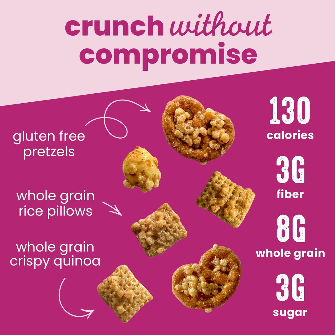 Dreamy swirls of creamy, peanut buttery bliss are blended with rich vanilla & a kiss of brown sugar for the ultimate sweet & salty treat. With party-ready petite pretzels, crunchy rice pillows, golden puffed corn & a crisp confetti of quinoa. Every batch is patiently baked & showered with love.