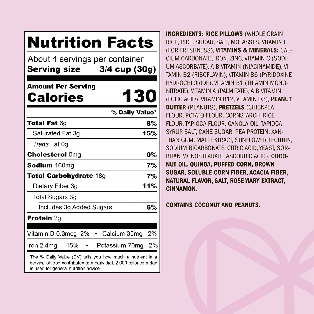 RICE PILLOWS (WHOLE GRAIN RICE, RICE, SUGAR, SALT, MOLASSES. VITAMIN E (MIXED TOCOPHEROLS) ADDED TO PRESERVE FRESHNESS. VITAMINS & MINERALS CALCIUM CARBONATE, IRON AND ZINC (MINERAL NUTRIENTS), VITAMIN C (SODIUM ASCORBATE), A B VITAMIN (NIACINAMIDE), VITAMIN B2 (RIBOFLAVIN), VITAMIN B6 (PYRIDOXINE HYDROCHLORIDE), VITAMIN B1 (THIAMIN MONONITRATE), VITAMIN A (PALMITATE), A B VITAMIN (FOLIC ACID), VITAMIN B12, VITAMIN D3), PEANUT BUTTER (PEANUTS), PRETZELS (CASSAVA FLOUR, POTATO STARCH, CHICKPEA FLOUR, HIGH OLEIC SUNFLOWER OIL, TAPIOCA STARCH, SALT, DATE SYRUP, YEAST, SUNFLOWER LECITHIN), COCONUT OIL, QUINOA, PUFFED WHOLE CORN, BROWN SUGAR, PREBIOTIC CORN FIBER, ACACIA FIBER, NATURAL FLAVOR, SEA SALT, ROSEMARY EXTRACT (SUNFLOWER OIL, ROSEMARY EXTRACT), CINNAMON.