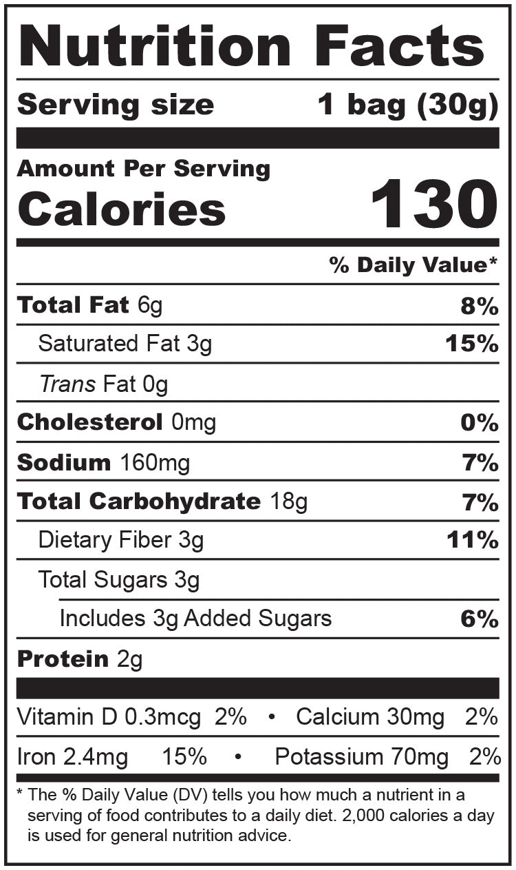 RICE PILLOWS (WHOLE GRAIN RICE, RICE, SUGAR, SALT, MOLASSES. VITAMIN E (MIXED TOCOPHEROLS) ADDED TO PRESERVE FRESHNESS. VITAMINS & MINERALS CALCIUM CARBONATE, IRON AND ZINC (MINERAL NUTRIENTS), VITAMIN C (SODIUM ASCORBATE), A B VITAMIN (NIACINAMIDE), VITAMIN B2 (RIBOFLAVIN), VITAMIN B6 (PYRIDOXINE HYDROCHLORIDE), VITAMIN B1 (THIAMIN MONONITRATE), VITAMIN A (PALMITATE), A B VITAMIN (FOLIC ACID), VITAMIN B12, VITAMIN D3), PEANUT BUTTER (PEANUTS), PRETZELS (CASSAVA FLOUR, POTATO STARCH, CHICKPEA FLOUR, HIGH OLEIC SUNFLOWER OIL, TAPIOCA STARCH, SALT, DATE SYRUP, YEAST, SUNFLOWER LECITHIN), COCONUT OIL, QUINOA, PUFFED WHOLE CORN, BROWN SUGAR, PREBIOTIC CORN FIBER, ACACIA FIBER, NATURAL FLAVOR, SEA SALT, ROSEMARY EXTRACT (SUNFLOWER OIL, ROSEMARY EXTRACT), CINNAMON.